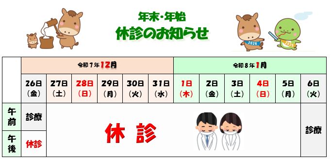 ☆12月26日(金)午後、棚卸しおよび院内年末大掃除のために休診とさせていただきます。